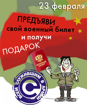 Приди 23 февраля в офис компании «Эзервэй», подключись к сети или пополни счет, предъяви свой военный билет и получи ПОДАРОК!