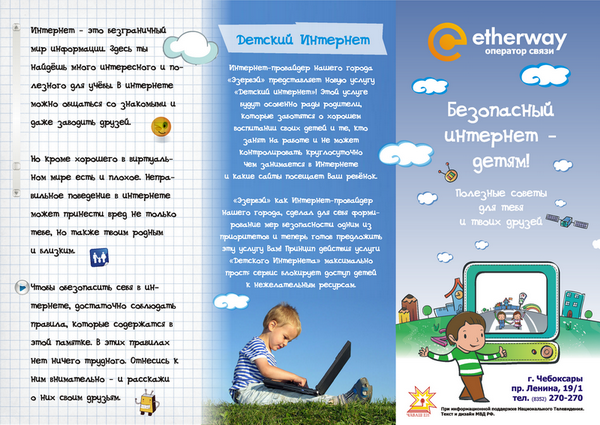С 15 сентября по 15 октября пришедшие в офис компании школьники вместе со своими родителями (действующие и вновь подключившиеся клиенты) при заполнении анкеты с вопросами по безопасному использованию интернета получат в подарок услугу «Детский интернет» сроком на 1 год. Все абоненты, заполнившие анкету, примут участие в розыгрыше призов. За 1 место – абонент получит планшетный компьютер, 2 место - WiFi–роутер, 3 место - вэб-камеру. Дополнительно будет разыграно и множество других не менее интересных призов. Розыгрыш будет проведен в Национальной библиотеке Чувашии и показан в эфире Национального телевидения ЧР.